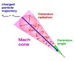 切仑科夫光的辐射出现在围绕粒子运动方向的圆锥内。在水中或玻璃中,这个围绕的角度约为40°(右图)。在空气这样的气体中,也会出现切仑科夫辐射,因为折射率与1很接近,所以圆锥的角度很小。水和玻璃的折射率很大,因而辐射切仑科夫光的本领很强。