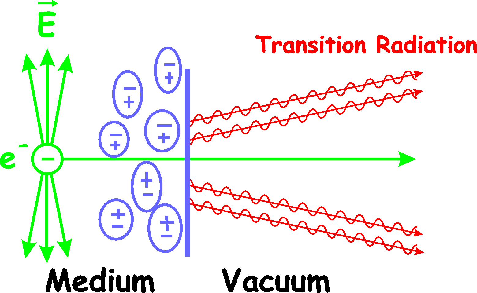 在不同的介质中带电粒子所建立的电磁场是不同的。高能带电粒子穿过不同介质的交界面时﹐来不及调整其所建立的场﹐使部分能量以电磁辐射形式发射出来,称为穿越辐射效应(右图)。穿越辐射效应早被弗兰克等人从理论上预言。