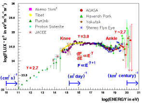 宇宙射线为来自太阳系以外的高能量粒子,能量约从109eV to 1020eV以上。在靠近地球的太空中,每秒每平方公分约有一个宇宙射线穿过。宇宙射线的主要成份是质子,及其它核种从氦核到铁核以上,甚至微量的镧系元素。人造粒子加速器其最高能量约为1013eV。右图显示了宇宙射线的能谱,横跨12个数量级的能量。能谱上有两个有重要物理意义的转折点,1015eV称为膝点(knee),3′1018eV称为踝点(ankle)。
