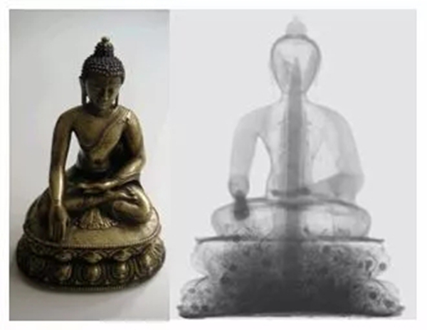 中子散射还可以协助考古人员对文物进行无损研究,例如我们想知道我国南北朝时期的佛像,其制造工艺是如何?我们显然无法把文物大卸八块进行分析。科学家用中子成像技术,可以看到佛像的中间有一根木制“主梁”。原来,中子对轻的元素,也就是原子系数小的元素非常敏感,中间的棍子是木头做的,也就是碳氢化合物,中子可以轻易地“看到”它。科学家也终于明白,这尊佛像的制造工艺和盖房子很像,先在中间立一根木梁,在木梁周围缠上“支撑架”,最终用黏土制成了佛像。