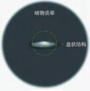 图5 银河系的物质分布:普通恒星分布在盘状结构上, 而暗物质则形成一个巨大的几乎球对称的晕状结构,称作暗物质晕。