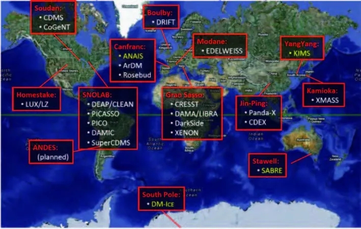 图7 世界上的地下实验室分布和相应实验室开展的直接探测实验