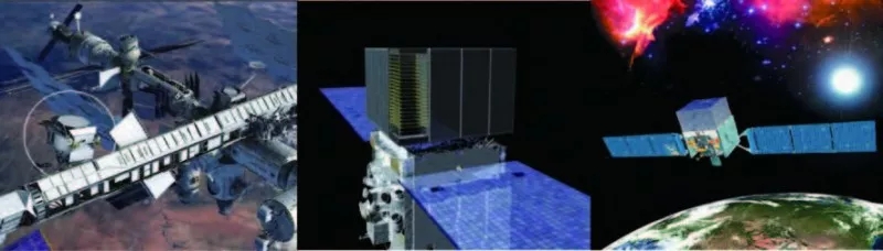 图9 几个空间的暗物质探测实验: AMS-02 空间站实验、 Fermi 卫星、“悟空”卫星