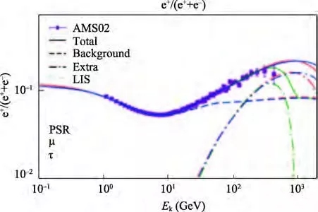 图10 AMS-02观测的宇宙线中正电子所占比例(点)和不同的理论模型解释(图中的实线)