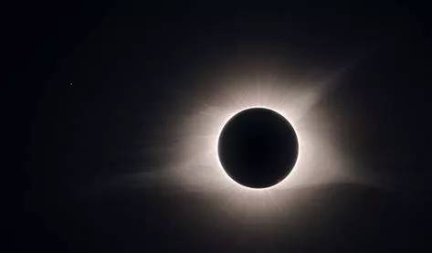 黑色圆盘是被月球完全遮住的太阳光球,边缘的红色特征属于色球,最外面的白色光芒是日冕结构,注意左上角那个小白点,就是狮子座的一等星轩辕十四