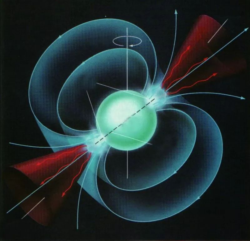 典型脉冲星的表面磁场高达1012高斯,自转在几毫秒到几秒之间。转动的磁场产生电场,电场将脉冲星磁层中的带电粒子加速到相对论性速度,相对论性带电粒子在磁场中可以辐射方向性很好的电磁波束。随着中子星的转动,辐射束可能周期性地扫过地球——类似于灯塔(如图1),在观测上表现为脉冲星。射电脉冲星,以及后来发现的伽玛射线脉冲星都是孤立的中子星,它们的能源来自中子星的转动能,即所谓的转动供能的中子星。