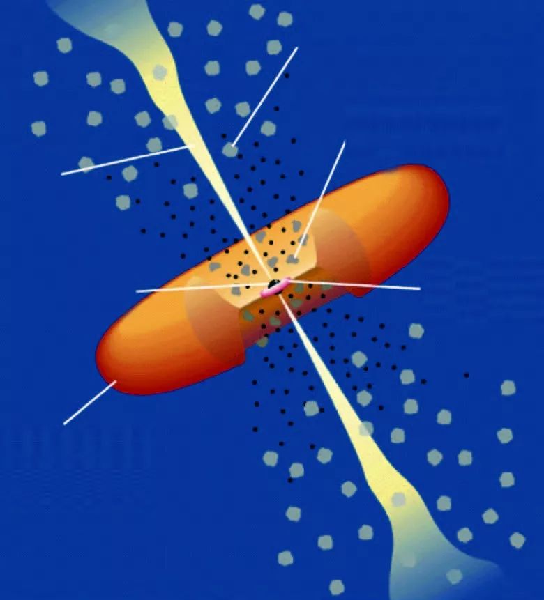 垂直于吸积盘的两个带状结构是来自黑洞的双边喷流,经常在射电波段和伽玛波段被观测到