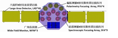 eXTP空间天文台将载有中欧合作研制的四组高性能X射线天文仪器:能谱测量聚焦望远镜阵列(Spectroscopic Focusing Array,SFA)、偏振测量聚焦望远镜阵列(Polarimetry Focusing Array, PFA)、大面积准直型望远镜阵列(Large Area Detector,LAD)、广角监视器(Wide Field Monitor),将实现大面积、高动态范围、高信噪比的空间X射线“能谱—时变”与“时变—偏振”观测。
