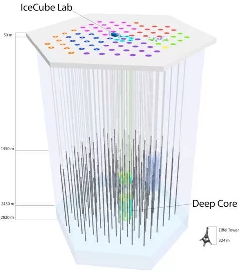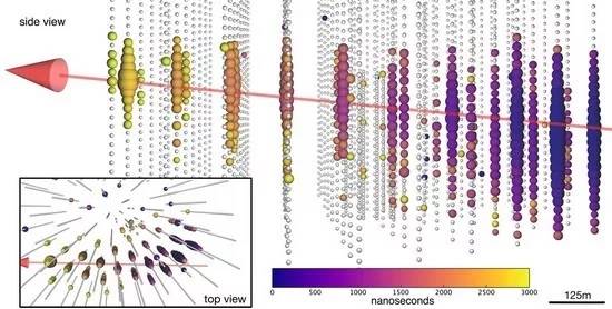2017年9月22日,冰立方探测到一个能量为290 TeV的中微子。作为对比,目前能量最高的加速器——欧洲核子研究中心的大型强子对撞机,只能把粒子加速到7 TeV。