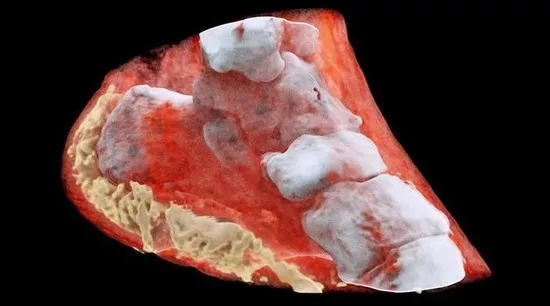 图为MARS扫描仪拍摄的一个踝关节的3D彩色X射线图像,可以看到脚踝的骨头、脚后跟区域的填充物(红色的软组织、白色的骨头,而脂肪则是浑浊的黄色)(图片来自网络)