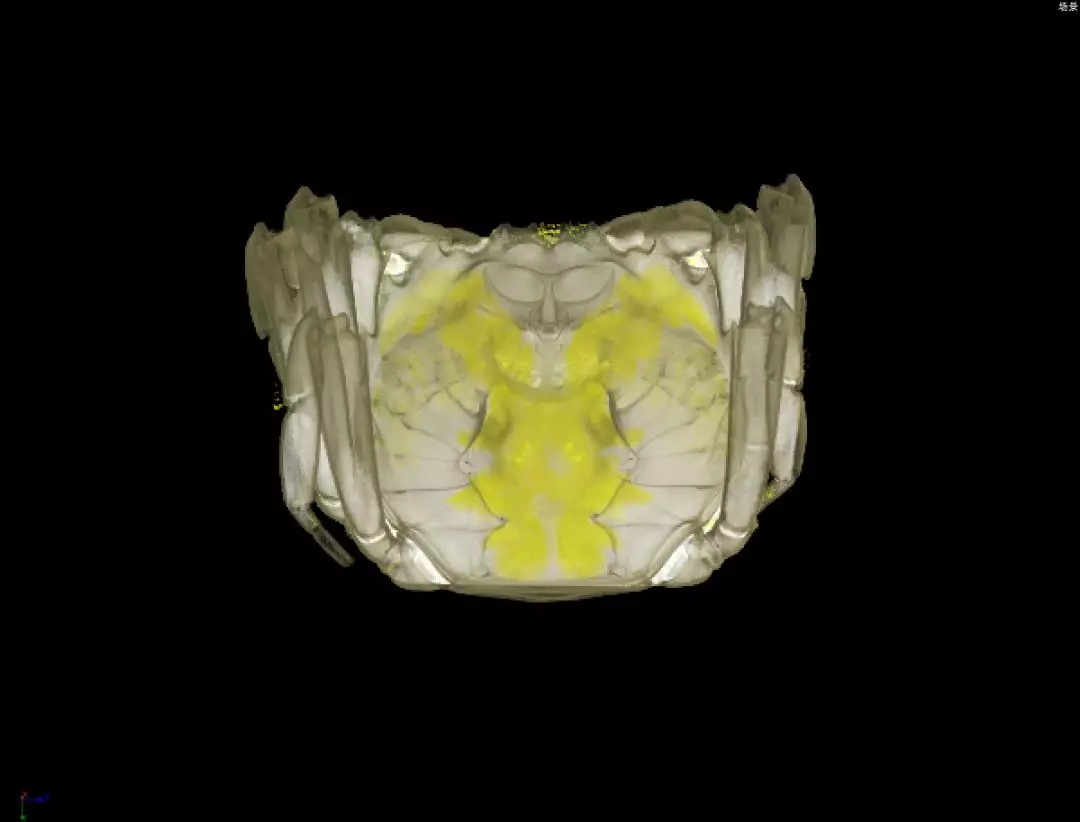 三维可视化软件,把这些断层图重构成了一个三维图,还原了它原来的样子。然后,这个数字螃蟹就任由我摆布了!