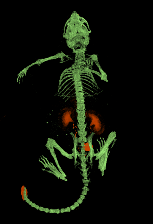 应用一:小鼠注射低浓度碘海醇后吸收边成像的结果,图中橙色为碘元素,绿色为骨骼