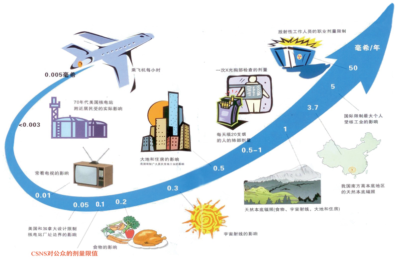 对中国散裂中子源建设可能带来的环境影响评价结果表明,中国散裂中子源运行时产生的中子、γ射线,以及少量放射性气体的排放,对场址边界外周围公众的年剂量水平大大低于国家标准GB18871规定的,对公众的剂量限值标准1mSv/a,能够保证公众成员的健康与安全。另外,中国散裂中子源运行过程中产生的O3等气体的浓度远远低于国家标准值,不会对周围环境产生不利的影响。