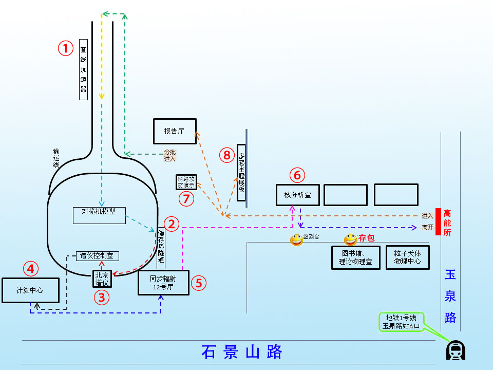 路线:直线加速器——储存环地下隧道——北京谱仪——计算中心——北京同步辐射装置——核分析实验室——网络攻防交互式演示棚——主题展板