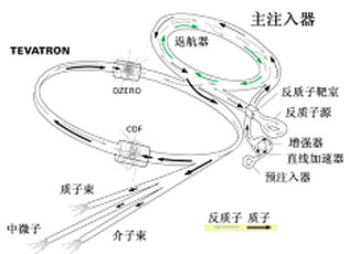 主注入器:主注入器1999年竣工,有以下功能:(1)将质子从8 GeV加速到150 GeV;(2)产生120 GeV质子,用于反质子的产生;(3)从反质子源接收反质子并把它们的能量提高到150 GeV;(4)将质子和反质子注入Tevatron。
