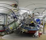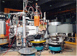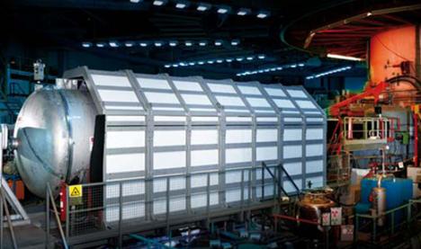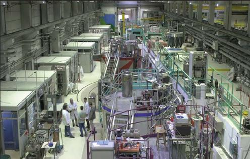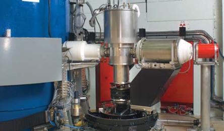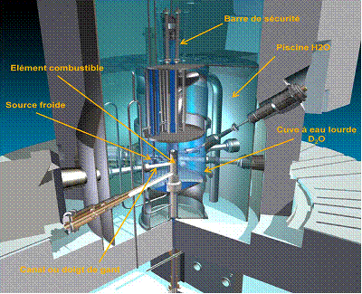 ILL的高通量核反应堆RHF(High-Flux Reactor)提供世界最高强度的中子源,拥有近40套先进的并不断升级改造的设备和仪器。它的核心部分是一个重水冷却型高浓缩铀燃料箱,核裂变产生的中子束强度达到1.5*1015 中子/厘米2/秒,热功率为58.3MW,速度2万公里/秒。它们在被重水冷却后可急速减速至2.2公里/秒,同时产生新一轮的裂变。RHF核心处设有3个装置,分别产生热中子(10公里/秒)、冷中子和超冷中子(700米/秒和10米/秒)。热中子源区的温度保持在2600。C,冷中子源形成一个含有20升-248。C液态氘区。冷中子通过和氘原子的不断碰撞,继续减速,科学家们根据需要通过单色仪和准直器选择光源,检测样品,以便认识各种形态的物质,发展新材料和开发新药品。