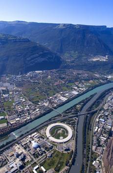 ESRF位于法国东南重要的科研和高技术工业城市格勒诺布尔(Grénoble)。该市是欧洲最高山脉阿尔卑斯山的“大门”,并有 “法国硅谷”之称。穿城而过的两条河流,伊泽尔河(Isère)和扎克河(Drac)在城西北郊汇合,ESRF就建在这两条河之间“半岛”的尖上。