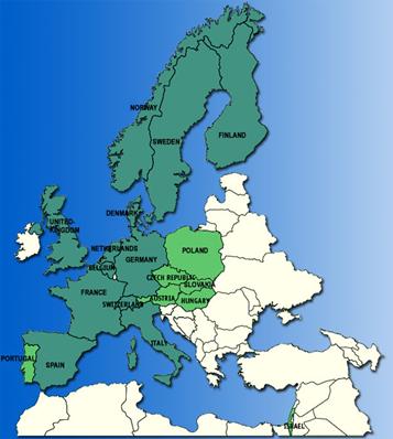 法国 27.5%,德国 25.5%,意大利 15%,英国 14%,西班牙 4%,瑞士 4%,荷兰、比利时 6%,丹麦、芬兰、挪威、瑞典 4%。其他:葡萄牙1%、以色列1%、奥地利1%、波兰1%、 捷克共和国、匈牙利、斯洛伐克1.05%。
