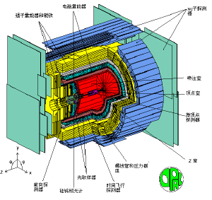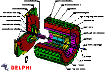 DELPHI实验由几层的粒子探测器组成,这些探测器在装置的中心拾取正负电子对撞产生的碎片。每层探测器在识别对撞中产生的粒子中起不同作用,这就帮助了科学家弄清对撞中发生了什么。(左图为DELPHI探测器)