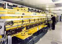 在汉堡的TESLA测试设备由一个电子源,一个超导加速节和一个磁铁结构组成。在磁铁结构中,被加速的电子被感应产生X射线激光的闪光。在这一测试设备上取得的成果是通往TESLA两个项目的里程碑。(左图为 TESLA 测试设备)