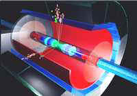 在像TESLA这样的直线对撞机里,正负电子在极高能量时发生对撞。在隧道的正中间,每个由100亿个粒子组成的束团每秒彼此对撞14000次。对撞中,正负电子互相湮灭,变成为纯粹的能量,在此过程中,正像大爆炸一样,形成新的基本粒子。借助探测器的帮助,物理学家们可以看到这些反应。探测设备像个4层楼高的建筑物,放在8层楼高的室内,布满了高技术设备。从发生无数次的对撞中,探测器找出真正物理学家感兴趣的那些少数事例。这真是犹如大海捞针。然后再对这些“事例”进行准确测量。(左图为探测器中粒子对撞的示意)