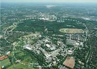 强子-电子环加速器(HERA)是汉堡DESY最大的加速器,1992年开始运行。HERA是世界上第一台,也是唯一的使两种不同类型的物质粒子,即质子和电子发生对撞的储存环装置。它有两个环型加速器,每个长6.3公里,安装在地下隧道里。其中一个将电子加速到27.5 GeV,另一个将质子加速到920 GeV。电子和质子在两个环的真空管内一连数小时按不同的方向运行。因为运行的速度几乎接近光速,所以粒子沿着HERA环每秒飞行大约47000次。(左图为DESY 的加速器) |