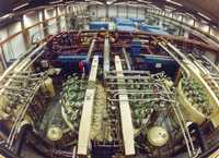 如果在高能时要引导HERA内沿轨道运行的质子围绕装置的曲线运转,强大的磁场是重要的。事实上,这些磁场必须是使用正常轭铁和铜线圈所获得的磁场的3倍。产生这样强磁场唯一切实可能的办法是借助超导 – 所选择的材料具有在极低温时没有任何损耗的导电能力。DESY开发的HERA质子环的650块超导磁铁的设计立刻取得成功,同时在世界范围内被采纳。HERA超导磁铁的工作温度为-2690C。为使6。3公里长的HERA里的东西适当的冷却,DESY于1986年建造了当时欧洲最大的冷冻系统。在2500米2的厅内,氦气被冷却直到凝固成固体。然后液氦被注入到HERA环里,从磁铁流过,使磁铁降到工作温度。就欧洲的工业而言,建造HERA意味着一个独特的机会。公司第一次有机会大规模地获得超导和低温技术的机会。(左图为冷冻厂) |