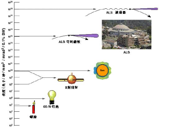 ALS是美国亮度最高的软X射线。这里产生的X射线比牙医机器中用的最大功率X射线管产生的X 射线的亮度高一亿倍。高的亮度意味着X射线高度集中。每秒X射线光子可被引导到一种材料的极小区域。