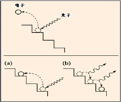 电子可吸收光子的能量并从物质逃脱(如图上部所示)。十九世纪晚期,科学家们观测到了这个现象,并把其称为光电效应。