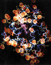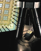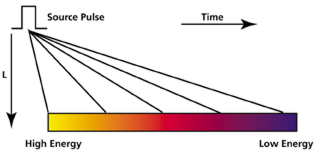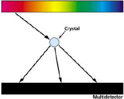 SNS的仪器如中子谱仪将用来确定晶体、陶瓷、超导体和蛋白质中原子的位置和排列。中子谱仪是如何工作的呢?由散裂中子源产生的中子脉冲沿着飞行轨道到样品。由于中子有各种能量和波长,所以它们按时间分布,给出一个到样品的连续谱。左图为通过让中子源的中子全谱从一个晶体散射进入到对位置敏感的多个探测器获得原子结构。当晶体中原子之间的距离与入射的中子的波长匹配时,那个中子就散射进入记录散射中子位置(散射角度)和到达时间的多个探测器中。结果是个峰值图,显示各种数量的中子到达多个探测器中每点的不同位置和到达时间。 这一图形告诉科学家不同原子在晶体中是如何排列的。以相同原理为基础的仪器可以用来确定玻璃和复杂流体的原子结构,或工业部件中的残余应力。测量非弹性散射的仪器需要测量中子跨越往返样品路线的时间。用这种方法,仪器可以确定重要材料的激发谱和使原子保持在一定位置的力。飞行时间技术使为每个中子脉冲搜集大量数据点成为可能。测量中子时间飞行仪器的效率和产生流强不断提高以加速器为基础的散裂中子源的能力,将来可以不断提供改进的中子源。右图为 从多个探测器在时间和空间上为高温超导体YBa2Cu3O7获得的图像。从此图像中可获得原子的位置。