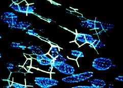 中子特别善于寻找氢原子的位置。例如,围绕DNA双螺旋结构的水分子结构,生命分子可以显像出来。图像显示水分子是兰色的,DNA的构架从图像左下部开始往上以明亮的股线形式出现。当通过降低样品周围的湿度,使水从股线周围去掉时,利用中子可以测量DNA结构的变化。