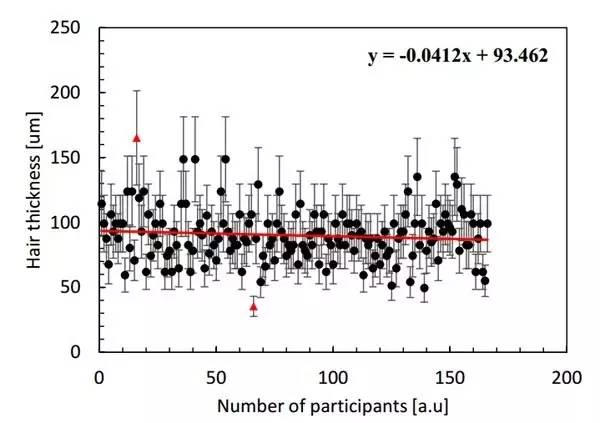 图1:头发直径测量结果(黑色实心圆点)与所有实验参与者次序的关系。两个红色三角(最高和最低的点)被排除。红色直线代表对实验结果的线性拟合(拟合公示在图右上角)。