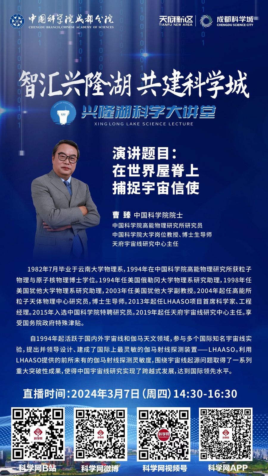 3月7日,由中国科学院成都分院和天府新区管委会共同主办的兴隆湖科学大讲堂将迎来第五期开讲,此次邀请的主讲人正是中国科学院院士,快盈v3研究员,“拉索”首席科学家、运行总负责人,天府宇宙线研究中心主任曹臻。他将带来在世界屋脊上,科学家们如何捕捉宇宙“信使”的故事。