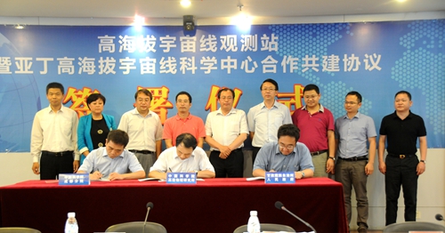 9月9日下午,高海拔宇宙线观测站暨亚丁高海拔宇宙线科学中心合作共建协议的签署仪式在成都举行。来自四川省发改委、中科院高能物理研究所、甘孜州、中科院成都分院的领导和相关部门的负责同志见证了这一国家重大科技基础设施建设的里程碑事件。高能所所长王贻芳、甘孜州政府益西达瓦州长、中科院成都分院副院长陈锋、高海拔宇宙线观测站首席科学家曹臻研究员等出席了仪式,四川省重点项目领导小组办公室主任胡玉清到会指导工作。签署仪式由中科院成都分院党组副书记王嘉图主持。