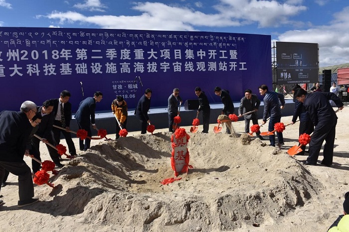 6月19日,甘孜州2018年第二季度重大项目集中开工暨国家重大科技基础设施高海拔宇宙线观测站开工仪式在稻城县海子山举行,标志着工程工艺设施开始进入集中安装阶段。甘孜州州委副书记、州人民政府州长肖友才,中科院成都分院分党组书记、常务副院长王学定,中科院高能所党委副书记、副所长罗小安,四川省经信委副主任王文胜,四川省科技厅副厅长陈学华,中科院高能所高海拔宇宙线观测站工程副经理何会海等领导、专家莅临会场指导。开工仪式由甘孜州委常委、纪委书记谭晓政主持。来自项目建设单位、监理、施工单位,四川省、甘孜州、稻城县相关政府部门干部及当地群众、新闻媒体记者400余人参加了仪式。