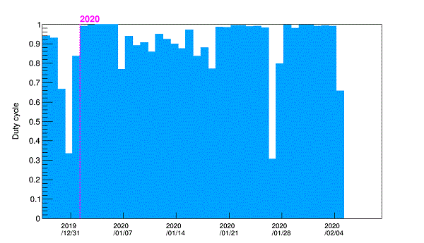 WCDA是LHAASO中数据量最大的一个装置,目前,两个水池的原始数据量已达到10TB/天的量级。探测器的运行基本实现了自动进行。当下,WCDA的工作状态可通过远程方式实时显示,警告或错误信息会及时自动发送给相关人员。春节以及疫情隔离阶段,探测器运行维护人员紧盯监控,并通过远程控制手段实现了对探测器的高质量维护运行。在过去20天的时间内,1#水池保持了90%以上的有效取数时长,仍处于试运行阶段的2#水池也到达了75%以上,从根基保障了LHAASO实验的科学观测。