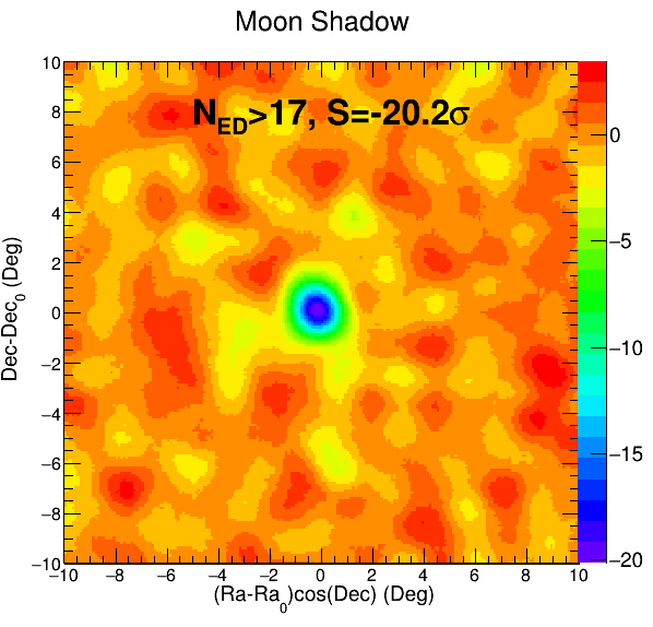 图2. KM2A的1/2阵列在2020年1月对月影的观测天图表明 探测阵列的指向精度、角分辨符合预期
