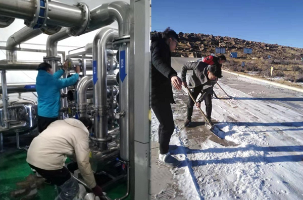 图4:稻城海子山一线人员在维护水循环系统(左) 及时清扫现场道路积雪(右)