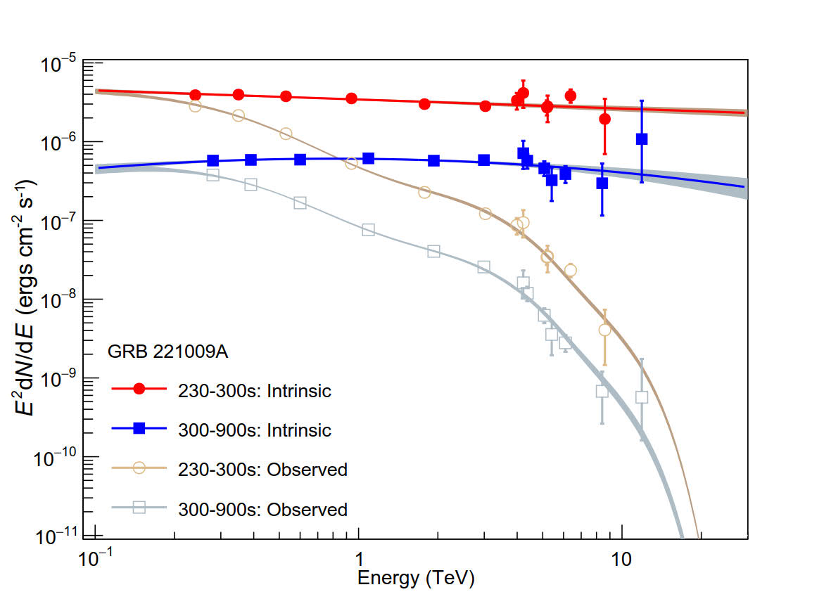 图1:拉索测量的GRB221009A在230-300秒和300-900秒两段时间的伽马射线能谱,空心点为地球上测量到的伽马射线流强,实心点为24亿光年外伽马暴发出的伽马射线流强。
