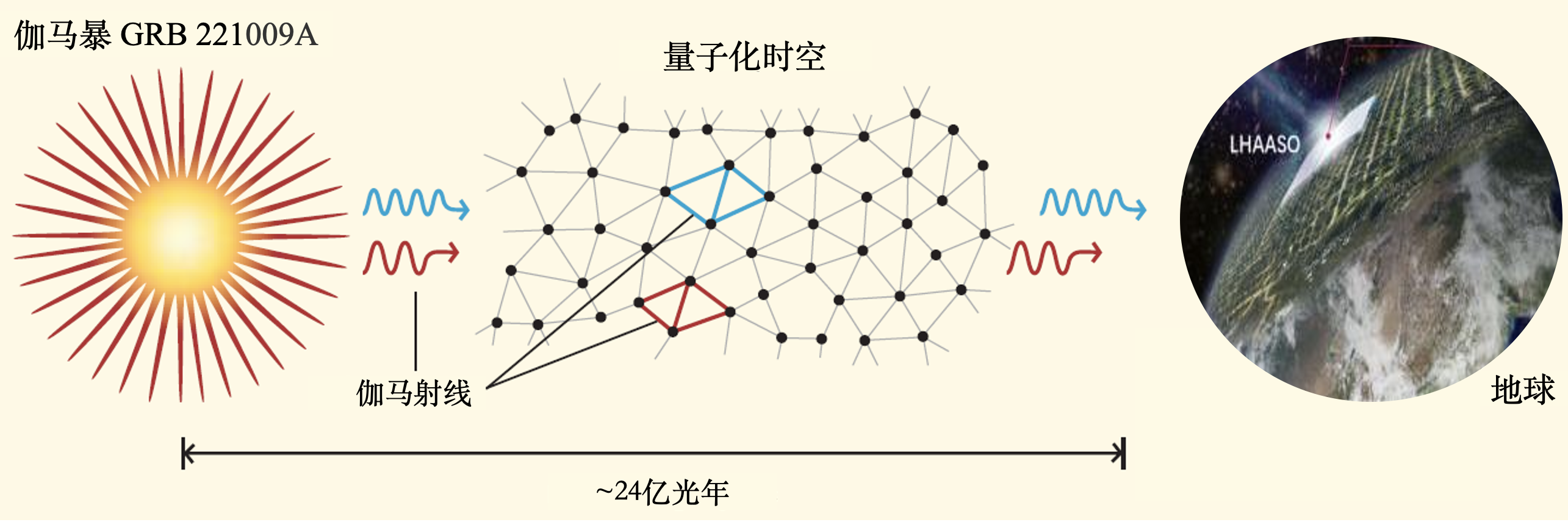 洛伦兹不变性是爱因斯坦狭义相对论的基础,保证了在不同运动参考系里物理规律是一样的,等同于光速是一个常数。然而,一些试图将量子力学和广义相对论统一起来的量子引力理论预言了时空不再连续,存在“泡沫”结构。泡沫化的量子时空在局域上破坏严格的洛伦兹不变性,从而导致光子在真空中的传播速度不再是常数,而是跟光子的能量有关(图1)。虽然洛伦兹不变性破缺所产生的这种真空传播速度的差异非常微弱,但是通过遥远距离传播的积累,不同能量光子的细微速度差就有可能表现为可探测的到达时间差。因此,发生在非常遥远的伽马暴成为开展这种测量的绝佳机会。