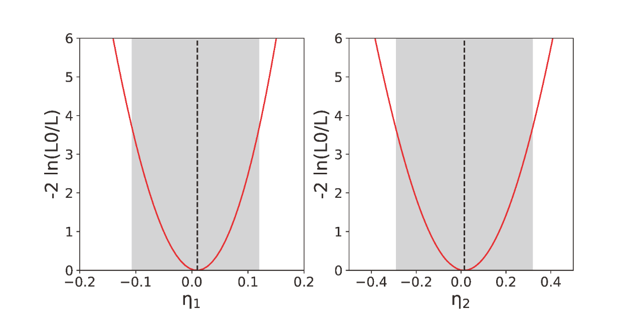 2LHAASO给出的量子引力能标参数h1h295%置信区间。h1阴影范围对应于一阶量子引力能标下限1.1´1020 GeV(超光速情景)与1.0´1020 GeV(亚光速情景);h2阴影范围对应于二阶量子引力能标下限7.1´1011 GeV(超光速情景)与6.9´1011 GeV(亚光速情景)。