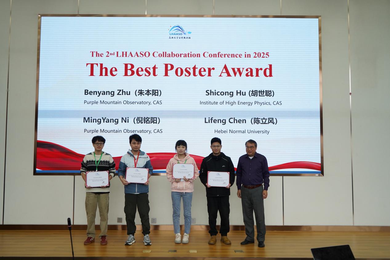 LHAASO合作组会议的墙报,既是合作组内年轻学生与学者展示研究成果、锻炼学术能力的核心平台,也是激发合作组内所有成员新研究方向、碰撞创新思路的重要载体。本次会议有效墙报47份,每份墙报在大会进行了4分钟的快速介绍,还有专门时段进行充分讲解、讨论。经过物理协调委员会及会议参会者的投票,最终评选出4个优秀海报,获奖者为来自紫金山天文台的朱本阳和倪铭阳、高能所的胡世聪、河北师范大学的陈立风。