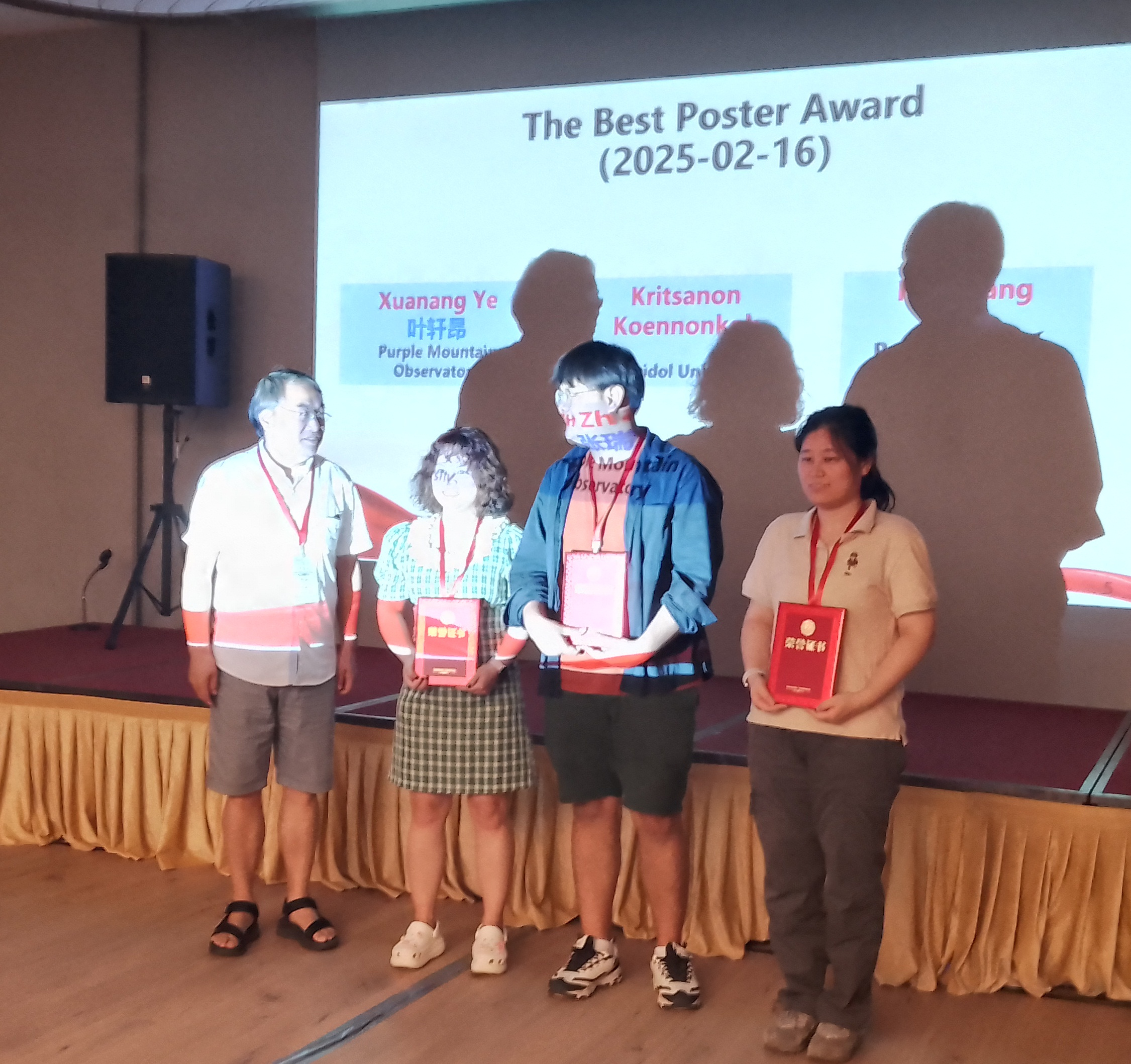 除了口头报告,另有墙报近40个,大会安排了墙报口头介绍时间和专门的展示交流时间。墙报交流时间是讨论最热闹的时候,年轻的学生学者与资深专家围聚一起进行内容切磋、方向延展。本次会议经无记名投票评选出三个最佳海报奖,获奖者分别为玛希隆大学的研究生Kritsanon Koennonkok、中国科学院紫金山天文台博士后张瑞和研究生叶轩昂。