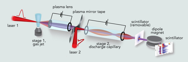 The final configuration—gas-jet injector, plasma lens, plasma mirror, discharge capillary second stage, and diagnostics—showed energy gains, for significant portions of the electron beam, of around a hundred million electron-volts.