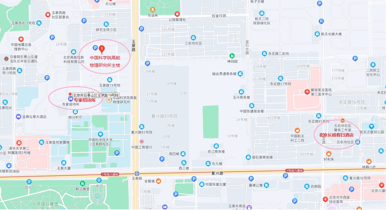 1. 高能所专家招待所(北京市石景山区玉泉路19号乙高能所院内,联系电话:010-88236088/88236810,参考价:375元/间、425元/间)