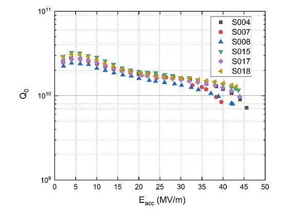 由高能所团队研制完成的六只细晶粒纯铌1.3GHzcell超导腔,2K垂直测试加速梯度均达到或超过了40MV/m。其中,S008腔最高加速梯度45.6MV/m,已接近TESLA型纯铌腔的理论极限;且S018腔在43MV/m梯度下的品质因数Q0达到国际领先的1.3×1010水平。