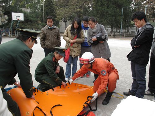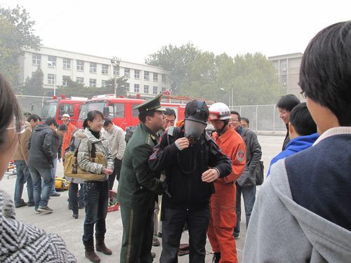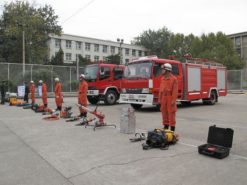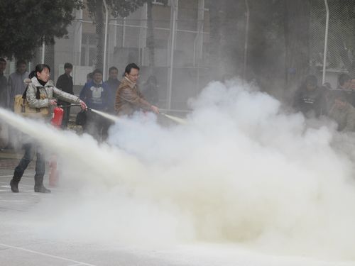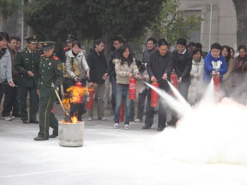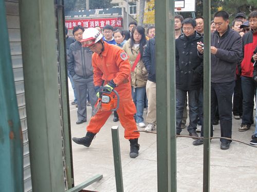 报告结束后,大家来到操场上观看了消防队员使用专用的消防工具对防火卷帘门、钢管、木柱等设施进行了破拆演示。随后,消防队员向大家介绍干粉灭火器的使用方法,并演示如何扑灭初起火灾。此时,在场职工都热情高涨,在消防队员的指导下,纷纷拿起灭火器材,对准火点练习起来。演练结束后,大家又兴致勃勃地来到消防设施前,了解空气压缩包、隔热服、缓降设施、通讯绳索等新型消防救护器材的原理和使用方法,并对感兴趣的设施进行亲身体验。