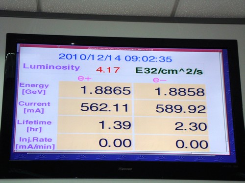 在圆满完成2010-2011年度第一轮同步辐射专用光的运行任务之后,北京正负电子对撞机又开始了新一轮的对撞调束及运行。加速器中心调束和硬件人员克服困难,经过四十多天的辛勤努力,解决了机器运行中遇到的各种故障,在12月10日、12日和14日,BEPCII对撞亮度连续突破最高纪录,最新的取数运行亮度纪录为4.17×1032 cm-2s-1。这是BEPCII亮度调束中的一个重大进展!