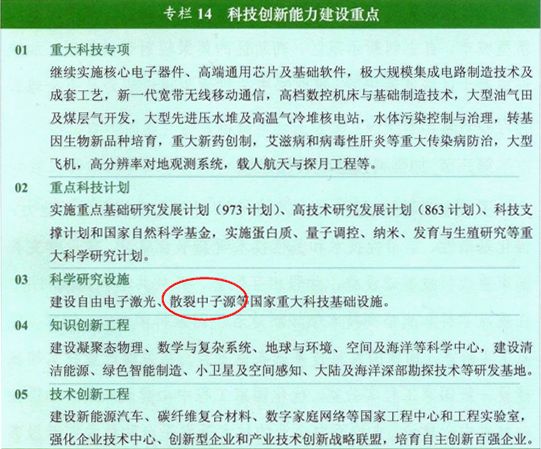 “十二五”规划第二十七章《增强科技创新能力》中提出,要“强化基础性、前沿性技术和共性技术研究平台建设,建设和完善国家重大科技基础设施,加强相互配套、开放共享和高效利用。在重点学科和战略高技术领域新建若干国家科学中心、国家(重点)实验室,构建国家科技基础条件平台。”作为世界一流的大型中子散射多学科研究平台,即将建设的散裂中子源名列“科技创新能力建设重点”。目前,散裂中子源工程正紧锣密鼓地为初步设计报告的评审做准备,力争早日顺利开工。