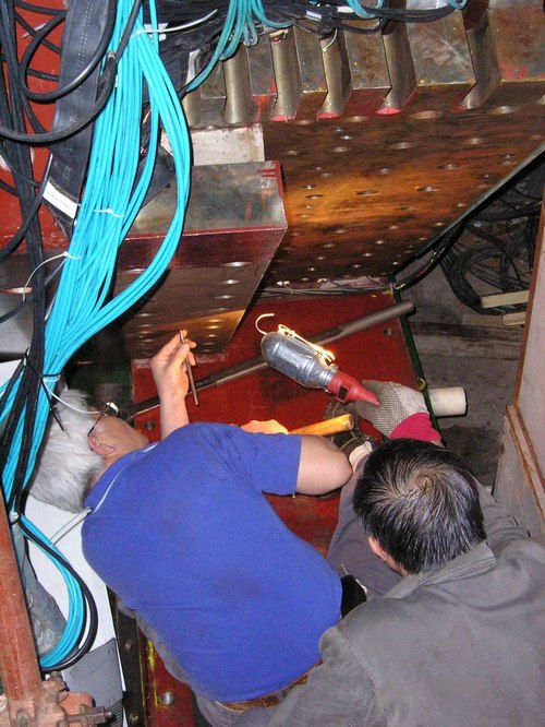 自7月16日以来,面对繁重的检修和升能改造任务,通用运行部职工相继放弃了高温假和国庆节休假,每周坚持六个工作日,每天勤勤恳恳、兢兢业业地奋战在对撞机的各个检修和改造现场。截至国庆节前,已完成了直线升能改造、输运线磁铁和支架、束测丝靶、Kicker拆装等一系列拆换和安装工作,以及水冷系统、电气系统配合直线升能所作的改造和所有通用设施的检修维护,第二对撞点设备西移和谱仪muon维修相关的拆装任务也已接近尾声。为了保证预定的开机计划,国庆期间需要完成谱仪西北端门隔板和磁轭边的拆除和北对撞点磁铁单元的西移。由于谱仪大厅操作空间狭小,以及东北门和西北门天车都不能吊装,需要在电子学间平台下安装吊装梁;同时,为了避免谱仪西北门下长磁轭边和下长隔板拆除后,端门重心超出底面而导致翻倒,技术人员和安装维修组同事特地制作了支撑工装和拆装下长隔板和下长磁轭边的托架。现场各种管线较多也使得人员在操作过程中必须特别的小心翼翼,以避免管线受损。通过同事们节假日的加班加点,辛勤劳作,此项难度最大的检修任务现已基本完成。
